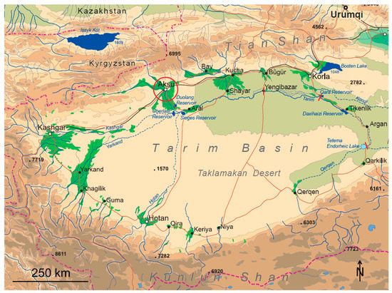 Tarim Basin. Highlighted in red are Aksu City with its surrounding oasis, and the middle and lower reaches of the Tarim River. Adapted from [19]; river section markings adapted from [20].
