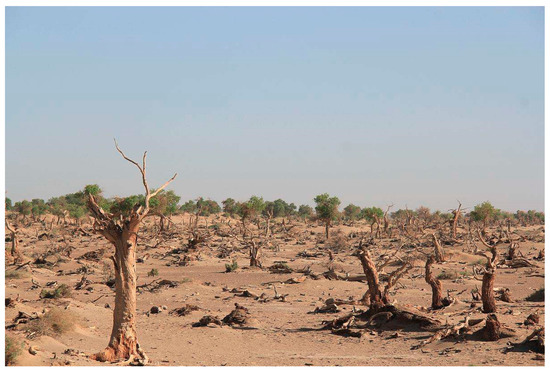 Before 1972, the river did not end at Daxihaizi but reached 320 km further down to the former terminal Detama Lake. This whole section dried up gradually after 1972 due to upstream water extraction [17,21]. Consequently, the vegetation died or deteriorated [33]. Back in 1958, 54,000 ha of Euphrates poplar forests had been recorded in the lower reaches of Tarim River, of which merely 6700 ha (12%) had survived in the 1990s [17]. Autochthonous Uyghur villages had to be resettled [26]. The strategic National Highway 218 that follows the course of the Tarim River’s former lower reaches between Tikanlik and the former terminal Detama Lake is threatened by shifting sand dunes [33].