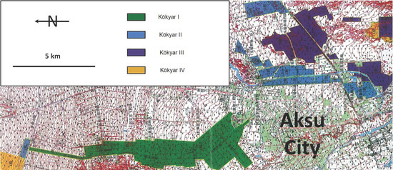 The areas of Kökyar I to IV consist of scattered patches surrounding Aksu City from north and east. Adapted from [2].