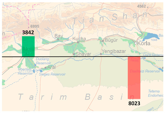 One of the upstream water consumers is the oasis city of Aksu, lying at the Aksu River, with an annual discharge of 3 billion m3 of water or 77% of Tarim River’s overall water yield being its main tributary [41]. The geographical position of Aksu City is close to Kyrgyzstan, on a long slope between the border mountain range of the Tian Shan in the north and the Taklimakan Desert in the south, at 41°10’ N and 80°15’ E, and at an altitude of 1100 m a.s.l. (above sea level). Its population reached 580,000 in the year 2012 [42]. Due to its location on the Aksu River, Aksu is water-rich, which allowed for the development of irrigation agriculture, forming a huge river oasis in the west, east and south of Aksu City (ca. 1000 km², including Awat and Onsu County) [43]. However, the surrounding deserts become very present, whenever the regular hot and dry north winds blow down from the Tian Shan, raising dust and sand from the barren areas north of the oasis and covering Aksu City in dust and sand storms (annual average of 11.5 sand storm days with visibility less than 1 km) [2].