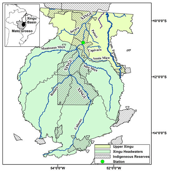 - Velasquez, H.Q.C.; Bernasconi, P. Fique por Dentro: A Bacia do Rio Xingu em Mato Grosso; Instituto Socioambiental, Instituto Centro de Vida: São Paulo, Brazil, 2010. [Google Scholar]