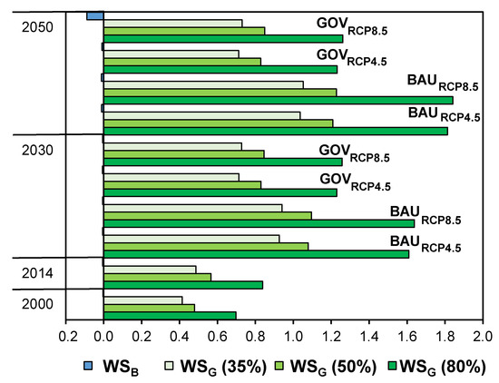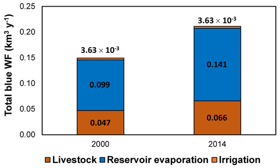 Between 2000 and 2014, the sum of cropland and pasture areas increased 31% from 4.7 Mha to 6.2 Mha. Changes in the consumption of blue water expressed by the total blue WF increased from 0.153 km3 y−1 in 2000 to 0.218 km3 y−1 in 2014 (Figure 2). The blue WF was dominated by agriculture, representing 97% of total water use, followed by domestic and industrial uses (Table S5). Water evaporation from small farm reservoirs represented 66% of total agricultural blue WF in 2000, and 67% in 2014, followed by livestock drinking (respectively 32% and 31%) and irrigation (2% of total consumption in both years) (Figure 2). Between 2000 and 2014, the total area of small farm reservoirs increased 37% from 6914 ha to 9463 ha of water, leading to a total evaporation of 0.099 km3 y−1 and 0.141 km3 y−1, respectively. Domestic blue water consumption computed here was similar to values from ANA [26], which reported 3.47 10−3 km3 y−1 in 2007, while our industrial consumption estimates were three orders of magnitude smaller than the 3.55 10−2 km3 y−1 reported for 2007 [26]. Differences in industrial uses are primarily attributed to our separation of confined livestock from industry, as well as our focus on extractive and transformative industries. Combining livestock and industrial water consumptive uses raised our computed values closer to those reported by ANA [26]. The total blue WF increased with larger human and livestock populations in 2030 and 2050. In 2030, agricultural water use nearly doubled to 0.258 km3 y−1, while the combined industrial and domestic uses increased to 9.90 10−3 km3 y−1 (Table S5). In 2050, agricultural water use increased to 0.517 km3 y−1 and 0.391 km3 y−1 in the BAU and GOV scenarios, respectively. In the case of cattle confinement and early season soybean irrigation (GOVRCP8.5), consumption rose to 3.81 km3 y−1.