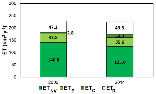 Changes in contributions to evapotranspiration (ET) for natural vegetation (ETNV), pasture (ETP), cropland (ETC) and residual landscapes (ETR) in the Xingu Basin of Mato Grosso in the 2000, and 2014 hydrologic years (September–August). Values obtained through the bottom-up approach as described in the text.