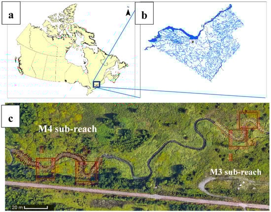 (a) Location of the study area within Canada (adopted from https://www12.statcan.gc.ca); (b) Study reach location in the Ottawa Study reach location in the Ottawa area (adopted from http://data.ottawa.ca/en/dataset/water); (c) Surveyed sections in Watts Creek sampling reaches M4 (to left) and M3 (to right) including total station surveyed points, flow from west (left) to east (right) (adopted from Google earth). Squares show the meander locations and their referred number within each sub-reach. Please note that the study area is situated at 45.340172° latitude, −75.880610° longitude.