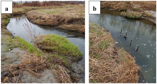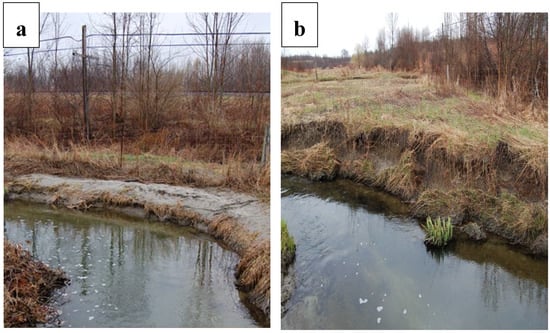 M4 sampling reach, meander bend restrained by the City of Ottawa rail, facing downstream: (a) Inner bank was overtopped during the previous high freshet flow, to an erosion pathway through the inner bank; (b) Vertical metal stakes used for bank stabilization. Pictures were taken by the authors on 30 April 2014.