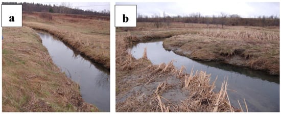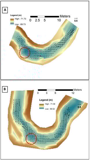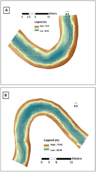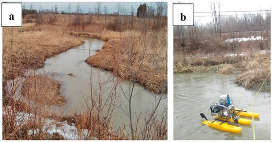 In order to evaluate the effect of the velocity field on the channel morphology, spatially intensive ADCP surveys were conducted in both study reaches during August (low flow) and October (moderate flow) 2014. According to the ADCP measurements, flow discharge was 0.17 and 0.45 m/s under low and moderate flow, respectively. It should be noted that the bankfull discharge was approximately 1.4 m/s [], and the return flow of the high flow was estimated to be 1.4 years []. A Sontek M9 River Surveyor ADCP was deployed on an Ocean Sciences trimaran riverboat (Figure 4b). Standing on opposite banks of the creek, we operated the trimaran boat with ropes and moved the boat downstream in narrowly spaced transects in a zigzag array. The measured depth-averaged velocity data were then post processed using in-house Matlab codes []. Parsapour-Moghaddam and Rennie provide further details on conducting a spatially intensive ADCP survey in a clay-bed meandering river [,,].