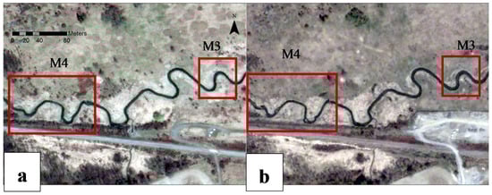 M3 facing downstream: (a) In the middle of M3, between the two major bends; (b) Last meander bend manifests regular meandering pattern with erosion on the outer band and deposition in the inner bank. Pictures were taken by the authors on 30 April 2014.