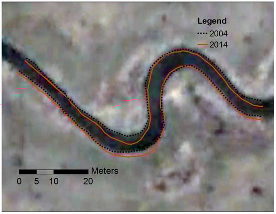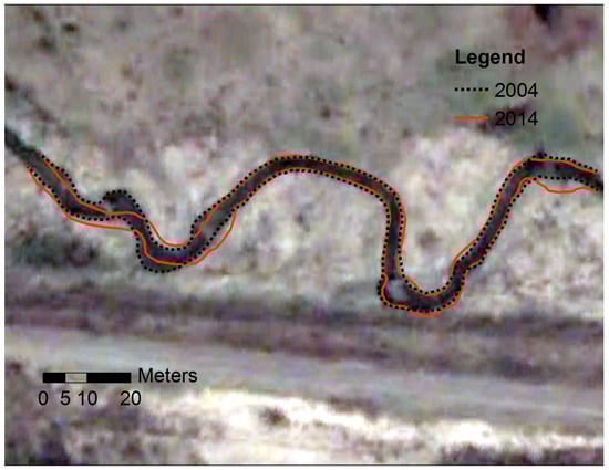 The expense of river hydro-morphological field studies has increased utilization of aerial survey techniques []. Relatively recent development of LIDAR technology allows for accurate measurements of bank locations and elevations []. The City of Ottawa has collected LIDAR data for various parts of the city during different years. This study employs available LIDAR data of the study creek from 2006 obtained from the National Capital Commission (NCC). We converted the LIDAR data to DEMs using ArcGIS. Historical aerial photographs were acquired using Google Earth. The photos were registered using georeferencing tools available in ArcGIS. Stationary ground control points for rectification were obtained using corners of the buildings, road intersections, rail trail, solitary trees and large rocks nearby the study site. Figure 6 shows the aerial images of the study reach from 2004 and 2014. It should be noted that both aerial photos show the site condition in the summer (June) which represents the low flow regime (discharge ~0.15 m3/s based on 2014 ADCP measurements) in the study creek.