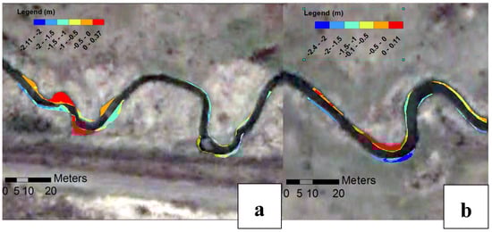 Erosion (negative) and deposition (positive) (m) from 2006 to 2014 in: (a) M4 and (b) M3 sampling reaches. Background image adopted form google earth image (2004).