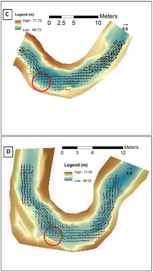 Measured depth-averaged ADCP velocities in the meander bends of the M4 sub-reach at: (a) first bend during August 2014 (low flow); (b) second bend during August 2014 (low flow); (c) fist bend during October 2014 (moderate flow); (d) second bend during October 2014 (moderate flow). Refer to Figure 1c for location of these bends. Surveyed bathymetric data (2014) are shown in the background. Note that the circles show the induced reverse eddies.