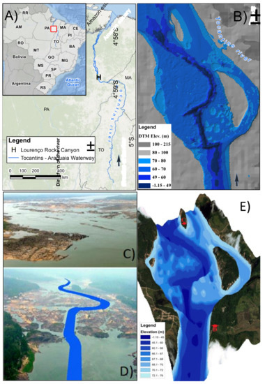 (A) Geographic location of the Tocantins River and the canyon location at Lourenço’s Rock; (B) Bathymetrical map (above sea level); (C) Image looking downstream during low flow condition; (D) Image looking upstream during low flow conditions and indicating the navigation channel; (E) 3D bathymetrical visualization (vertical exaggeration = 15) overlaid on a satellite image and (C,D) viewing directions.
