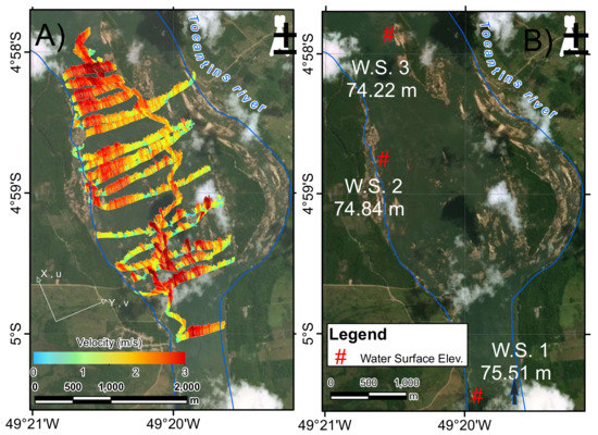 Measurements in Lourenço’s Rock Canyon; (A) ADCP trajectories with colored depth-averaged velocity vectors (April 2015); (B) River banks during high flow are shown in blue, and the location of the three gaging stations with measured values of the water surface elevation (April 2015) is presented.