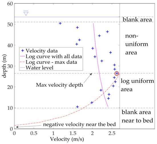 The log law is often used to estimate shear stress in open channels and rivers, as presented in Keulegan [36]. Based on the assumption that the velocity profile in open channel flows has a logarithmic shape, the “Law of the Wall” can be described by the von Karman–Prandtl Equation.