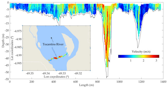 In April (flood season) and October (drought season) 2015, several flows and velocity measurements were performed in Lourenço’s Rock Canyon using an acoustic Doppler current profiler (ADCP), model M9, series SN-3754 of Sontek Inc. (San Diego, CA, USA) [20]. The equipment was installed with fixed support on a moving boat, and the installation depth of the transducer was 0.47 m below the water surface. The equipment was coupled to a real-time kinematic (RTK) global positioning system providing sub-decimeter accuracy for the measurement coordinates.