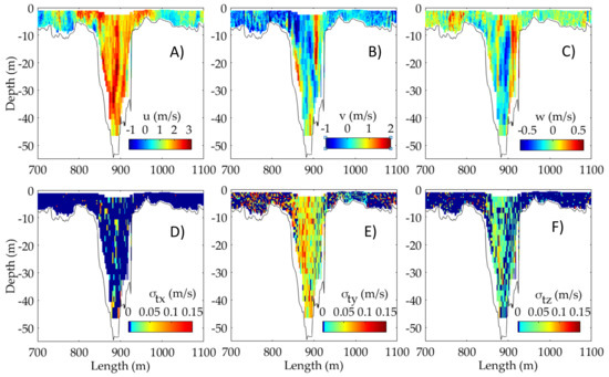 Flow velocity profiles over the canyon part (April 2015); (A–C) Magnitude of mean velocity components <u> (longitudinal), <v> (transversal), <w> (vertical) over cross-section; (D–F) Magnitude of turbulent velocity fluctuations.