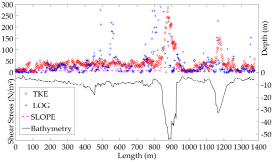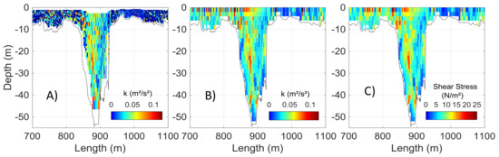 Applying the TKE method, the velocity data and standard deviations were used to compute the turbulent kinetic energy (k) in all measured cells. For situations where the instrument noise was higher than the turbulence fluctuations, the k value was considered equal to zero. Afterward, all values were interpolated (natural neighbor) on an equidistant vertical grid, to eliminate changing vertical cell sizes due to frequency shifts and to extrapolate the blanking area. The value used was the ADCP maximum vertical cell size in the canyon (2 m). The horizontal grid sizes were maintained (i.e., varying according to boat speed). Afterward, shear stress and eddy viscosity were computed for each cell using Equations (5) and (13). The shear stress results for the TKE method in the canyon area are shown in Figure 7.
