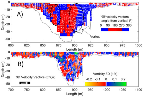 (A) Distribution plot of the <vw> direction (angle from up) resulting velocity in the vertical plane (<vw> = (<v>2 + <w>2)0.5) and schematized identification of vortex structure; (B) Vorticity (ω) of the canyon section part.