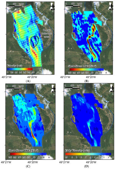 To improve future field measurements, we recommend adding extra points with fixed ADCP measurements along each section to evaluate the shear stress results with an extensive time series. To improve the vertical analysis, equipment with a different frequency to check the velocity near the bottom should be used. For longitudinal analysis, the maximum distance should be only 2 times the transversal distance data.