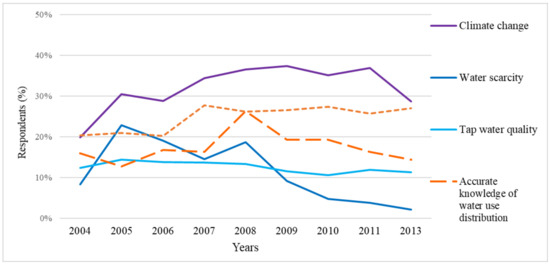 This section presents a descriptive analysis of the evolution of public opinion in the three periods under consideration: pre-drought (2004), drought (2005–2008), and post-drought (2009–2013). This exercise has a two-fold purpose. First, to test whether perceptions about water-related environmental problems are affected by drought, and second if these potential changes in perceptions are sustained over time.