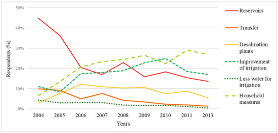 As summarized in Table 1, during the period of drought (2005–2008), public preferences concerning water management policies underwent significant changes and, what is more remarkable, is that these changes persisted during the post-drought period (2009–2013). The construction of reservoirs and the transfer of water lost support during the drought period and continued to decrease significantly during the post-drought period. The 44.8% of the respondents that showed preference for the construction of reservoirs in 2004, dropped to 24.1% during the 2005–2008 drought, and then it fell even further to 15.8% in the post-drought period. Water transfer, which was less popular than reservoirs to start, presents the same trend: from 9.9% of support in 2004 to 6.5% during the drought, and 2.3% during the post-drought period.