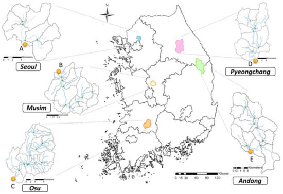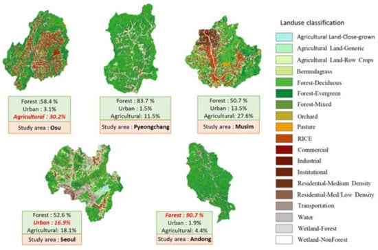 The distribution of land use in the study watersheds differs as shown in Figure 2. Among the five study watersheds, those with high forest density are located in Andong, urbanized watersheds are located in Seoul, and those in the Osu watershed are concentrated in agricultural watersheds.
