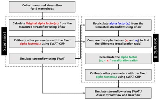 In this study, SWAT was calibrated using two methods (Scenario I, II), as shown in Figure 4, and the results (alpha factor and baseflow) from the two methods were compared. In order to compare the effectiveness of the two methods (Scenario I, II), five study watersheds (Seoul, Osu, Pyeongchang, Musim, and Andong) with different watershed characteristics were studied. In the case of Scenario I, the alpha factor was calculated from the measured streamflow using Bflow, and the alpha factor was applied to the SWAT model as a fixed parameter. The remaining parameters were calibrated by SWAT-CUP. This method has been commonly used for SWAT calibration. However, in this study, we found that the alpha factor was underestimated when reanalyzing the alpha factor from the simulated streamflow following calibration (refer to Section 3.1). Thus, as an alternative method, Scenario II was suggested that could adjust the alpha factor to improve baseflow prediction accuracy. In the case of Scenario II, the alpha factor was reanalyzed from the simulated streamflow (Scenario I) using Bflow and compared to the original alpha factor used in Scenario I to calculate the difference. The alpha factor was recalibrated based on the difference (recalibration ratio) and then applied in SWAT.
