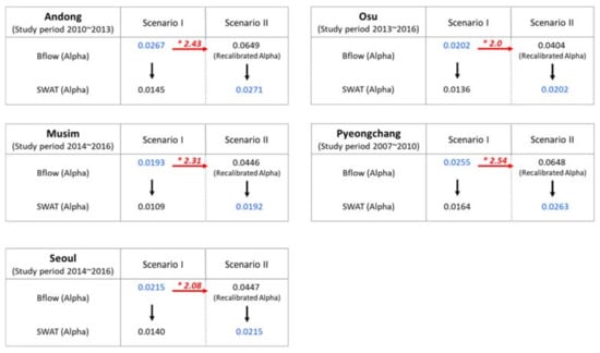 Recalibration of alpha factor for the recession curve for five study watersheds. The values in red represent the differences between the alpha factors calculated from measured and simulated (calibrated) streamflow in Scenario I and the recalibration ratio applied in Scenario II. The blue color in Scenario I is a calculated alpha value by Bflow. The blue in Scenario II is a calculated Alpha value by Bflow after applying the recalibrated alpha to SWAT.