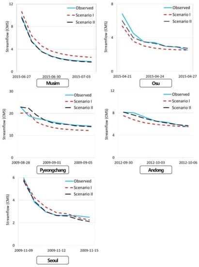 BFI (Baseflow index) was analyzed based on measured streamflow of five study watersheds using Bflow. The BFI represents the characteristics of aquifers in the watershed and plays an important role in determining the characteristics of the runoff. The BFI results of five study watersheds were calculated (Seoul 0.52; Osu 0.58; Musim 0.68; Andong 0.58; Pyeongchang 0.60). Among the five study watersheds, Musim, where the baseflow rate is highest when compared to the direct runoff rate, has the largest value of BFI, while Seoul has the smallest value of BFI. The land use in Seoul is impervious due to urbanization relative to other watersheds. This means that the direct runoff ratio is larger than other watersheds. Table 5 shows the results obtained by separating the baseflow from streamflow using Bflow. Since the influence of low flow rate is bigger than that of the high flow rate, the result of Scenario II is more accurate than that of Scenario I on prediction of baseflow. The highest values of NSE, R2, RMSE, MAE, and d were found for the Musim watershed for the baseflow results. In addition, the difference between Scenarios I and II of the Musim watershed was great. This is because the Musim watershed has less influence from precipitation than other watersheds as it has the lowest precipitation. This indicates that the influence of low flow is greater than the influence of specific high flow, such as during the flood season, and the low flow is sensitive to the baseflow.