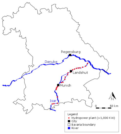 Map of Bavaria (Germany) with the location of the Isar River, Munich city and the hydroelectrical power plants at the Isar.
