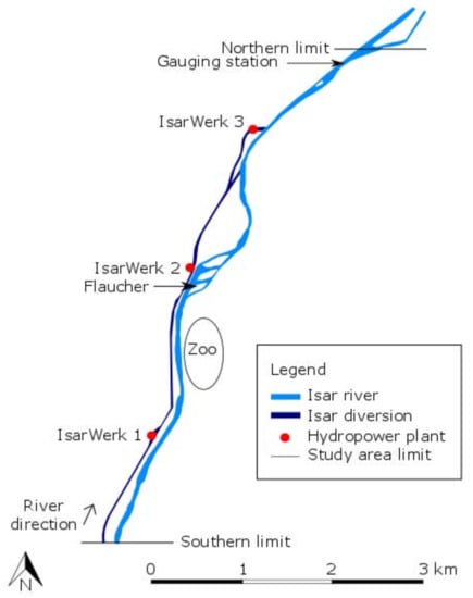 The objectives of this study were (i) to investigate the effect of change of minimum water flow on physical aquatic habitats and (ii) to identify the best minimum water flow strategy in the context of water diversion to secure habitats for target fish species in a case study. The investigations were carried out in the hydromorphologically restored main channel of the Isar River in Munich (Germany) (Figure 1). Most of the Isar water (93% of the mean annual discharge) is diverted into a side channel to supply hydroelectric power plants. As part of a restoration project, intense negotiations were carried out with users, NGOs, and the energy producer to increase the minimal discharge flowing into the restored river section. Identification of the best water-sharing scenario should provide important insights for this and future restoration projects. We hypothesized that an increase in minimal water flow would have a positive effect on the physical habitat suitability for fish species and tested if the overall aquatic habitat quality is the best when water diversion is removed. We tested these hypotheses by modeling habitat suitability under different discharges for three fish species, which were a target of the restoration, i.e., Thymallus thymallus L., Hucho hucho L., and Chondrostoma nasus L.