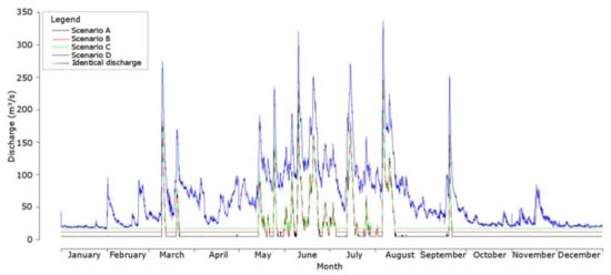Interestingly, in the scenarios with water diversion (scenarios A, B, and C), hydropeaking occurred frequently. It is a major ecological issue and it has been identified as one of the most significant pressures in alpine streams causing quick alterations in habitat quantity and quality []. Fish species are the group of aquatic organisms that are best able to adapt to long-term changes in hydropeaking by changing their habitat preferences, provided that heterogeneous river morphology is given [,]. Noack and Schneider [] examined habitat suitability during hydropeaking events and found a significant shift in suitable habitats of juvenile European graylings from the main channel towards gravel bars at river banks. The high flow velocities and water depth in the main channel were above those preferential to the juvenile graylings, while the gravel bar provided a favorable combination of water depths and flow velocities. Further research should also investigate the shifting location of habitats as well as the change in quality and quantity of habitats during minimum flow conditions.
