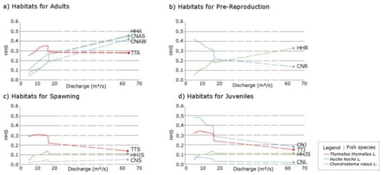 Hydraulic habitat suitability (HHS) for the twelve habitat types considering discharge variations from 5 to 68.5 m³/s: (a) Habitat for Adults C. nasus in winter (CNAW), C. nasus in summer (CNAS), T. thymallus (TTA), and H. hucho (HHA); (b) Habitat types for Adults pre-reproduction H. hucho (HHR) and C. nasus (CNR); (c) Habitat type for Adults spawning T. thymallus (TTS), H. hucho (HHJS), and C. nasus (CNS); (d) Habitat types for Juveniles C. nasus (CNJ), T. thymallus (TTJ), and H. hucho (HHJS), and for larval development of C. nasus (CNL).