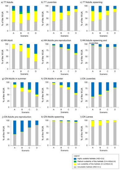 Percent of the Weighted Usable Area (WUA) that is characterized from highly suitable to unsuitable habitats for each scenario considering each habitat type of Thymallus thymallus L. (a–c), Hucho hucho L. (d–f), and Chondostroma nasus L. (g–l).