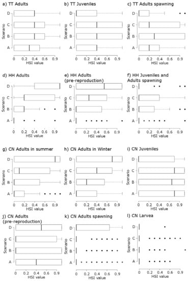 The highest HHS for T. thymallus was found at 16.5 m³/s and the highest proportion of highly suitable habitats (HIS > 6) for scenario B was: TTA = 26.1% (Figure 5a), TTJ = 25.5% (Figure 5b), and TTS = 22.8% (Figure 5c). The difference between scenarios B and C was not statistically significant. The HSI values differed between scenarios A, B (or C) and D for all of the studied habitats (p < 0.01, Kruskal–Wallis and pairwise test). Scenario A had significantly lower HSI values than scenarios B and C. An increase from 5 to 12 m³/s in minimal water flow (A to B), increased the mean HSI values for all studied habitats, i.e., TTA (Figure 6a), TTJ (Figure 6b), and TTS, (Figure 6c). A major increase in water quantity, as simulated by scenario D, decreased the HSI values of all the investigated habitat types (p < 0.01, Kruskal–Wallis and pairwise test). The best scenario for Adults was C, but for recruitment, it was B (Table 4). While highly suitable habitats for Adults were near to the zoo (Figure 2), highly suitable habitats for recruitment were located at the Flaucher (Figure 7a–c).