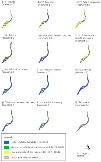 The HHS for Adults C. nasus increased with discharge (Figure 4a), remained very low for spawning (Figure 4b), and decreased with the discharge for recruitment (Figure 4c,d). The largest proportions of highly suitable habitats (HIS > 6) for Adults during the summer (CNAS) and the winter (CNAW) for scenario D were: 46.7% (Figure 5g) and 42.8% (Figure 5h) of the wetted area, respectively. Contrarily, the largest proportion of highly suitable habitats for Juveniles (CNJ) and for Adults during the pre-reproduction period (type CNR) for scenario A were: 56.5% (Figure 5i) and 54.97% (Figure 5j) of the area, respectively. Highly suitable habitats for spawning and larval development (CNS and CNL) remained rare: 5.22% (Figure 5k) and 5% (Figure 5l) of the wetted area, respectively. While the mean HSI of habitats for Adults during the summer (Figure 6g) and the winter (Figure 6h) increased with discharge, it decreased with discharge for Juveniles (Figure 6i). The mean HSI value for Adults in the pre-reproduction period decreased with discharge, increased for scenario D, and achieved the medium HSI value again (Figure 6j). Interestingly, mean HSI of habitats for spawning remained very low, but for scenario D, the variation in HSI value was important and locally reached a very high value (Figure 6k). However, for larval development habitats remained unsuitable. The best scenario for Adult survival and reproduction was D, but for recruitment, it was A (Table 4). While highly suitable habitats for Adults and Juveniles were located at the two third south of the river section, included the Flaucher (Figure 7g–l), highly suitable habitats for spawning activities and larval development were almost inexistent.