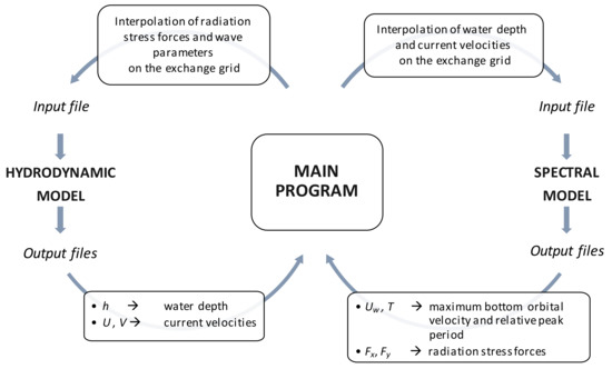 The whole process is managed by a main program that runs hydrodynamic and SWAN modules alternatively, as suggested by the flow chart depicted in Figure 1, until the simulation ends.