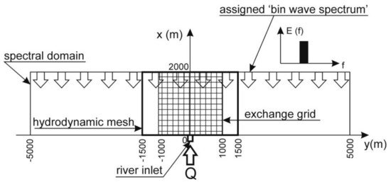 The hydrodynamic mesh is slightly different from that of Petti et al. [29]: it consists of a rectangular channel river inlet entering into a 3000 m large and 2000 m long basin (Figure 2). The elements are rectangular, with a size of 5 m in the x-direction (along the longitudinal axis of the jet) while in the y-direction (along the cross section of the jet) the cell dimension linearly increases from 5 m in a band close to the river centerline up to 50 m in the farthest part of the domain. This guarantees a higher density of grid cells in the central region, where the main characteristics of the flow field develop. Different grid resolutions have been tested, finding differences in the hydrodynamic numerical results in the order of a few percentage points. For this reason, the numerical results can be considered independent of grid size.