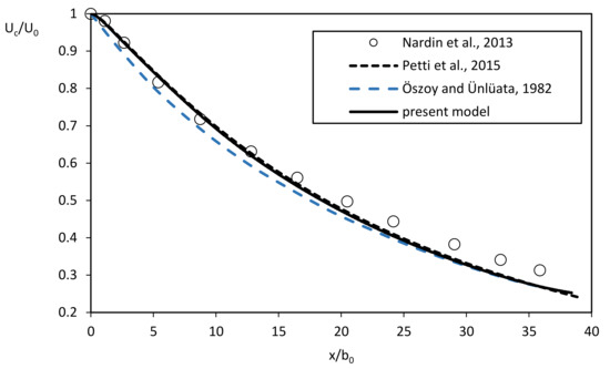 In the present test, the hydrodynamic results of the jet alone are compared with the results obtained in the analogous test carried out by Petti et al. [29] and Nardin et al. [30] by means of a quasi-3D numerical model that computes the vertical eddy viscosity with a standard k-ε closure scheme and the horizontal eddy viscosity with a large eddy simulation technique. In Figure 3 the normalized longitudinal velocity along the jet centerline is reported.