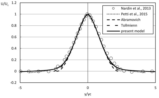 Similar considerations can be made about the normalized velocity profile, taken along a cross section and depicted in Figure 4; the two theoretical self-similar profiles proposed by Schlichting and Tollmienn for a free turbulent jet in the main region [10], are shown for comparison with numerical results.