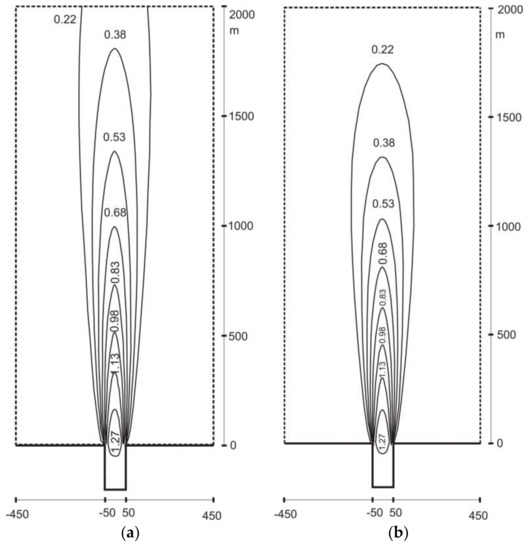 Linear contours of longitudinal velocity (m/s): (a) jet alone; (b) jet interacting with waves according to T5M simulation.