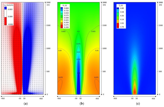 Variations obtained in the simulation T5M of the following parameters: (a) the z-directed component of the current vorticity, defined as the curl of the flow velocity vector, with superimposed arrows representing the mean direction of the waves; (b) the significant wave height Hs; (c) the relative peak period Tp.
