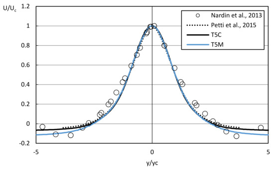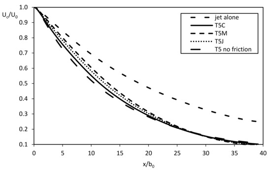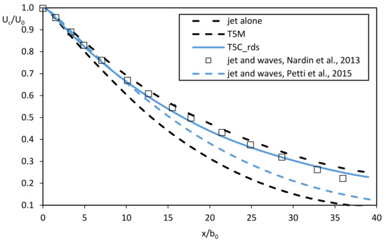 Petti et al. [29] have already highlighted that in the first region of the spreading jet, up to x/b0 = 10, the contribution to the decay of the velocity due to radiation stress and bottom shear stress is similar, due to the presence of major gradients of radiation stress toward the inlet. For this purpose, the simulation T5C has also been performed taking into account only the radiation stress contribution and neglecting the wave-bottom shear stress in the computation of τm. The results are very close to that of Nardin et al. [30], as can be seen in Figure 7.