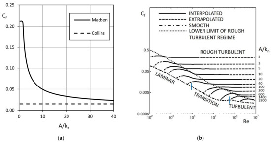 (a) Comparison between the constant value of the bottom friction coefficient Cf assumed by Collins [37] and that computed by Madsen et al. [38] as a function of the relative roughness A/kn; (b) friction coefficient diagrams proposed after Kamphuis [18,41].
