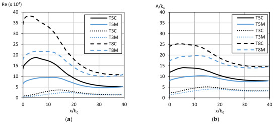 The second important aspect, relevant to this work, is the different longitudinal velocity decay obtained in T5C and T5M simulations. It can be seen in Figure 8 that the discrepancies, due to the bottom-friction effects, increase when moving toward the jet inlet. For low gradients in the velocity of the jet current that occur away from the inlet, the curves substantially coincide. On the other hand, where higher gradients of velocity are registered the two frictional approaches give different results. This happens from the inlet up to x/b0 = 20. Within this initial region, the Doppler effect of waves against the current is more pronounced, leading to a reduction in the relative wave period as attested also by Nardin et al. [30]. Together with the period, the relative roughness A/kn also decreases.
