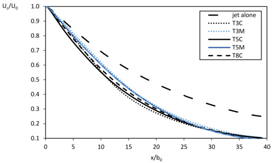 Longitudinal velocity Uc, taken along the jet centerline, normalized with the velocity at the jet inlet, U0. In the abscissa, x is the distance from the start of the zone of established flow (ZOEF) normalized with the half-width of the inlet, b0.
