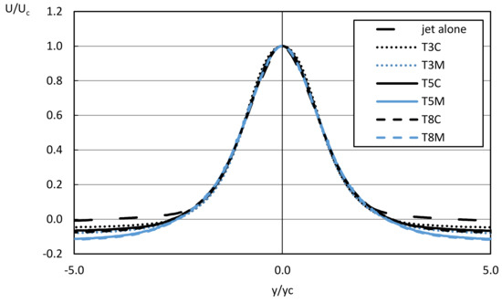Normalized longitudinal velocity, in a cross section taken at 780 m from the jet inlet in the case of jet alone and with the superimposed wave propagation with peak periods of 3 s, 5 s and 8 s.