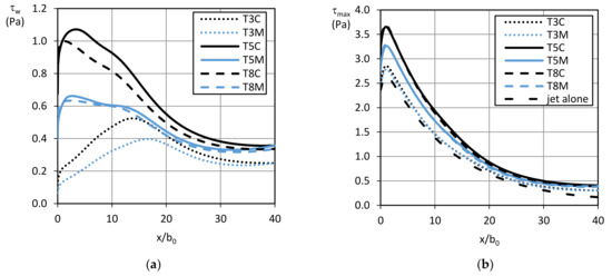 Bottom shear stresses along the jet centerline: (a) τw in the performed simulations; (b) comparison between the maximum bottom shear stress of the jet alone with those computed in the interactions with waves.