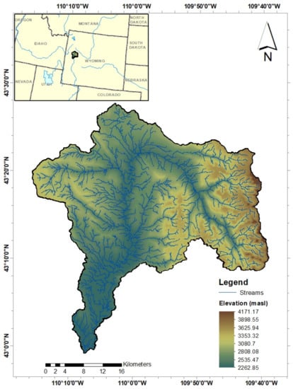 The upper Green River basin in Wyoming, U.S, chief tributary to the Colorado River, is selected to conduct this study (Figure 1). It rises in western Wyoming in the Bridger-Teton National Forest and flows south through Sublette County and western Wyoming. The selected catchment has a drainage area of 1220 km with a mean slope of 13.24%. The east portion of the catchment is mountainous and characterized by high elevations whose snowmelt supports the majority of water-year streamflow []. The presence of a large elevation relief, steep slopes and wide-changing valleys makes this an appealing region to apply and test this methodology.