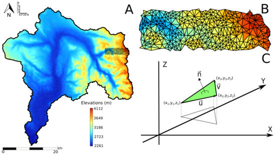(A) Irregular-mesh model of study watershed; (B) Sample zoom region with TIN elements. Each triangle’s elevation is obtained from the mean of its three vertices’ values; (C) Normal vector to a triangular plane determined by the cross product of vectors and .