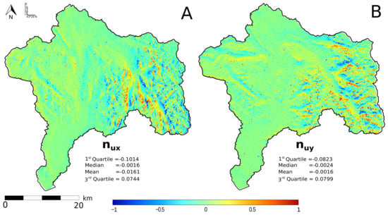 Thus, dividing the components of by its magnitude, a normal unit vector () is obtained. Figure 3A,B illustrate the horizontal components of ( and ) for the Green River Basin along with quartile metrics of the spatially-distributed values. It is observed that west and south facing slopes slightly dominate across the landscape of this basin with marked direction contrasts on the eastern Wind River Range mountains (Figure 3A,B).